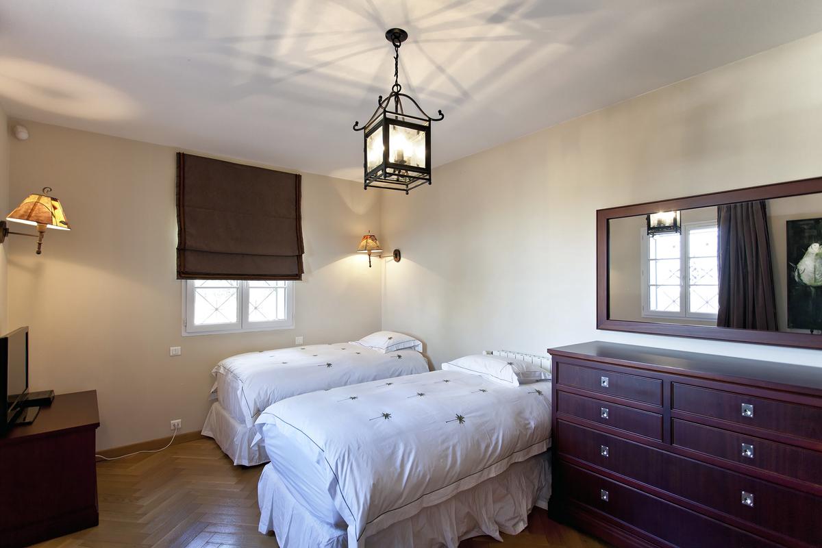 Chambre 5 (chambre du personnel) avec deux lits jumeaux (2 x 90 cm). Salle de bains avec douche, WC et lavabo.