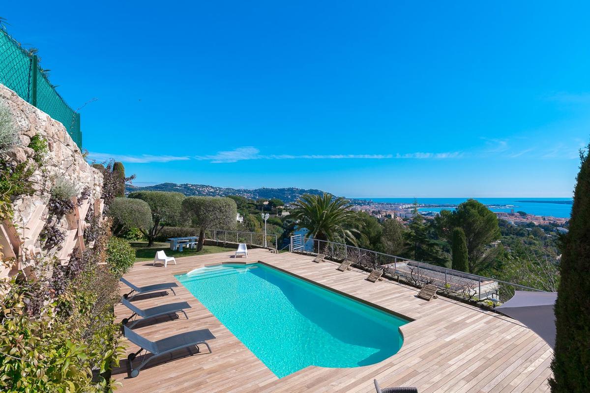 Cette splendide villa des années 1850 règne dans un cadre privilégié sur les hauteurs de Cannes. La propriété, avec son parc bordé d’arbres, est située dans un quartier résidentiel calme, à seulement 10 minutes du centre-ville. La villa est à la fois classique et moderne, et associe à merveille différents styles: architecture authentique, design intérieur sophistiqué, mobilier contemporain et décoration soignée dans chaque chambre. Les installations haut de gamme de la villa sont rehaussées par son élégance raffinée. Le rez-de-chaussée comprend un grand salon avec cheminée qui s’ouvre sur une salle de billard et une magnifique cuisine entièrement équipée. Au deuxième étage, vous trouverez un deuxième salon, ainsi que deux chambres avec salles de douche privatives, toutes dotées de balcons et d’une vue magnifique sur la mer. Vous pourrez profiter de la même vue depuis les trois chambres du deuxième étage. À l’extérieur, une passerelle mène à une belle terrasse en bois offrant une vue panoramique sur Cannes, des transats et une grande piscine de 11 x 4 m et pool house (chambre, kitchenette et salon).