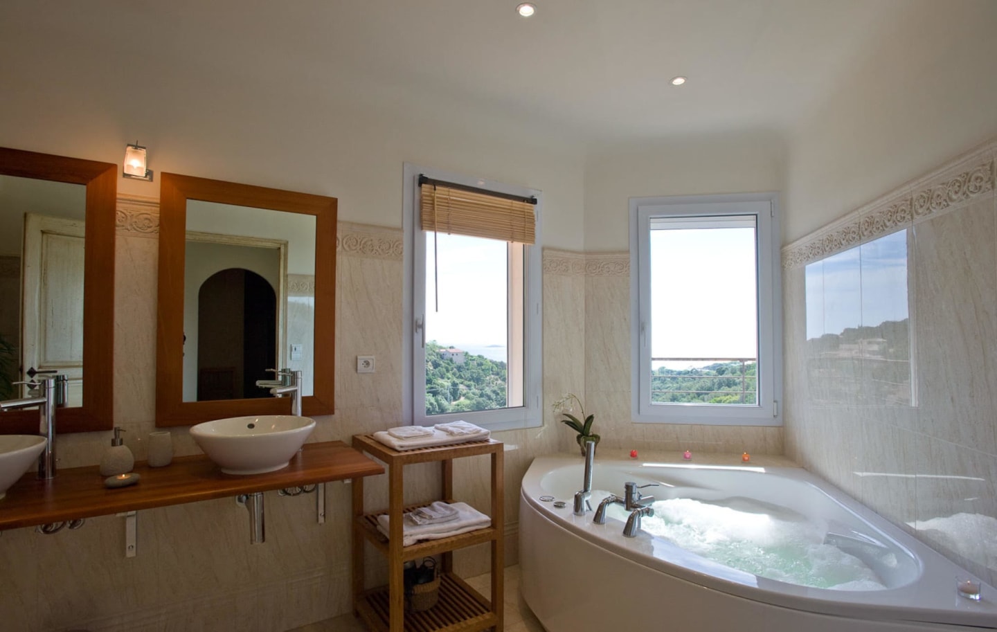 Chaque chambre a sa propre salle de bain pour une intimité parfaite. Le salon est organisé autour d’une cheminée. Puis, il s’ouvre sur sur la terrasse par de grandes baies vitrées. En fait, dans cette villa tout aussi cosy et lumineux été comme hiver.