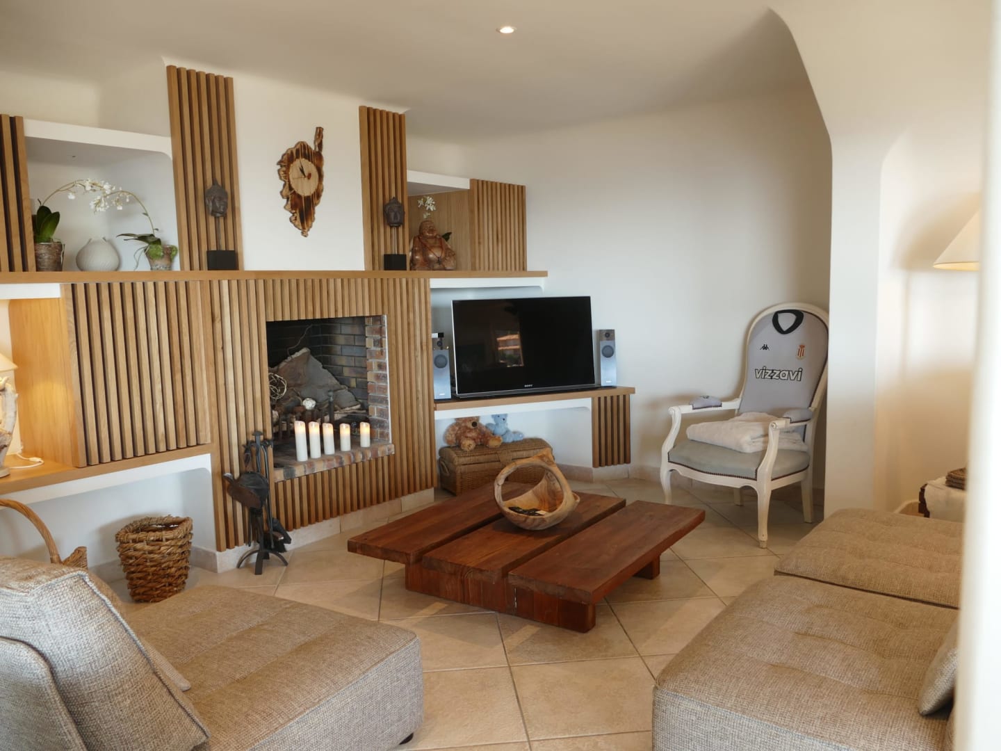 Rez-de-chaussée.• Salon avec cheminée, accès terrasse et vue mer • un coin salle à manger • Cuisine tout confort • Chambre 2 – lit queen size (160cm), salle d’eau attenante avec WC